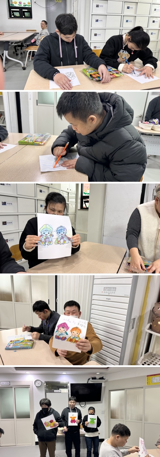 저마다 좋아하는 색깔로 도안에 그림을 그리고 추가적으로 알록달록한 색종이로 한복을 접어 종이에 붙여