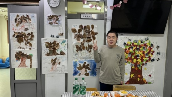 미술 교실 시간에 만들었던 실제 낙엽을 도화지에 붙이고 공백 부분에 그림을 그렸던 작품들을